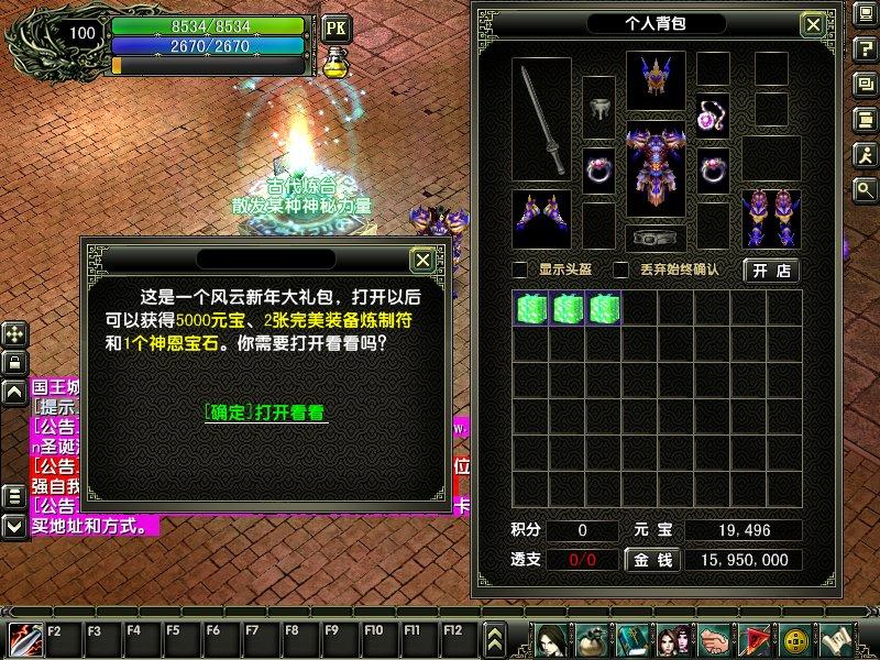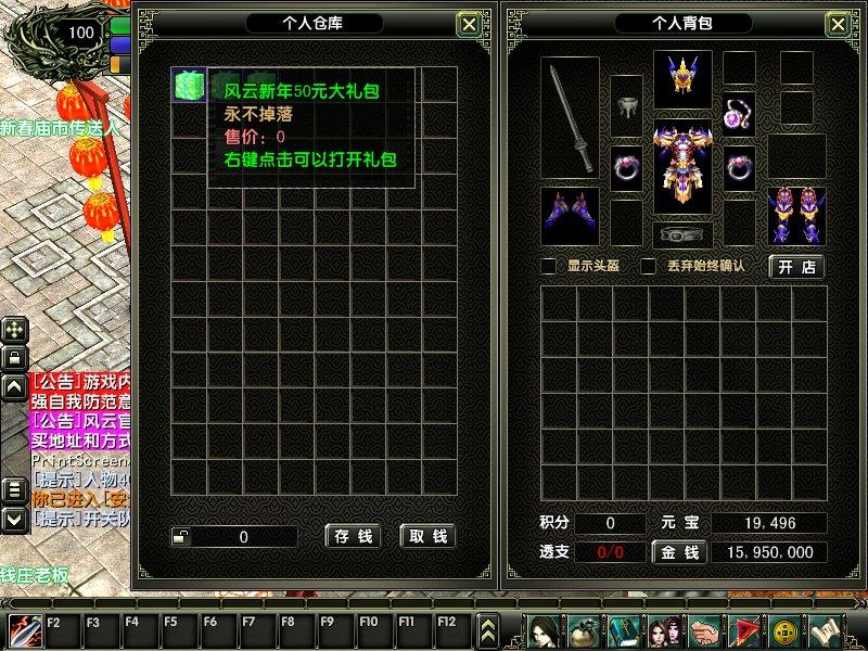 如何获得礼包:充值赠送后,对应冲值卡的礼包将出现在您的仓库里,鼠标右键点击使用大礼包,会获得各种礼包内礼物,每个“风云新年大礼包”占1×1的空间,您最好在仓库里面留出一点位置哦,不然礼包将不能赠送到您的仓库里面。