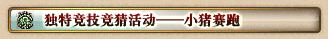 云中的爱恨交织,争斗中的战火洗礼;不断地打怪升级,不停地追求圆满……游戏中的您,是否感到一丝疲惫? 等级的差距让您痛苦不堪,追逐的脚步从不敢轻易停歇;装备的优劣让您望而却步,什么时候才能与高手一论长短? 答案就是现在! 不用再担心你只是个初入风云的菜鸟,也不要在为自己的级别装备高高在上而欣喜若狂,来到小猪大赛场,一切的一切,都是那么公平与简单。骑上可爱小猪,驰骋在弯曲的赛道上,甩开游戏中一切烦恼与疲惫。今天,我们就在速度上比个高底,在操作上见个真章! 当一个新手打破一个老鸟的不败神话,当您再次成为目光追逐的焦点…… 快跑!小猪大赛场,带给您另一种游戏的愉悦,圆满您另一种游戏的境界! “小猪快跑大赛场”还将开放“有奖猜猜猜”活动,只要您能猜对本场比赛中,是哪一只队伍赢得了最后的胜利,那您将获得丰富的奖励。