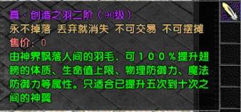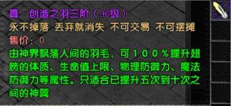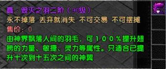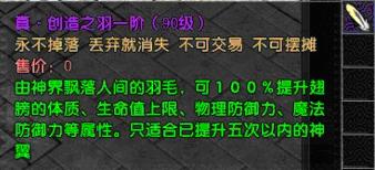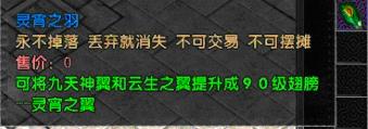 灵宵之羽:使用后可把云生之翼直接升级到90级翅膀,而九天神翼升级则还需要一定数量的灵能水晶作为材料才可升级成90级翅膀。 升级成功后都可获得相对应原翅膀属性阶级的真·创造之羽(90)和真·毁灭之羽(90)。真·创造之羽(90)和真·毁灭之羽(90)可100%提升成功翅膀属性。