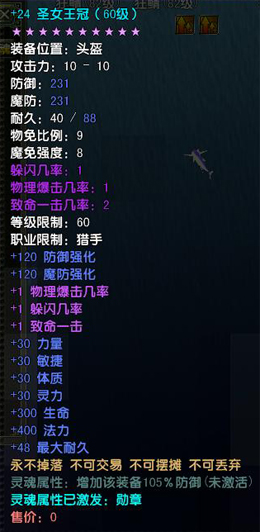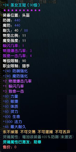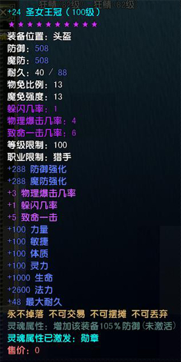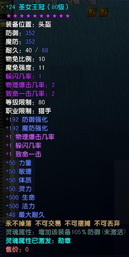 1、所有等级圣女王冠均为10星魔化装备,灵魂属性提高防御105%;